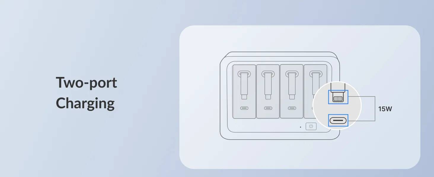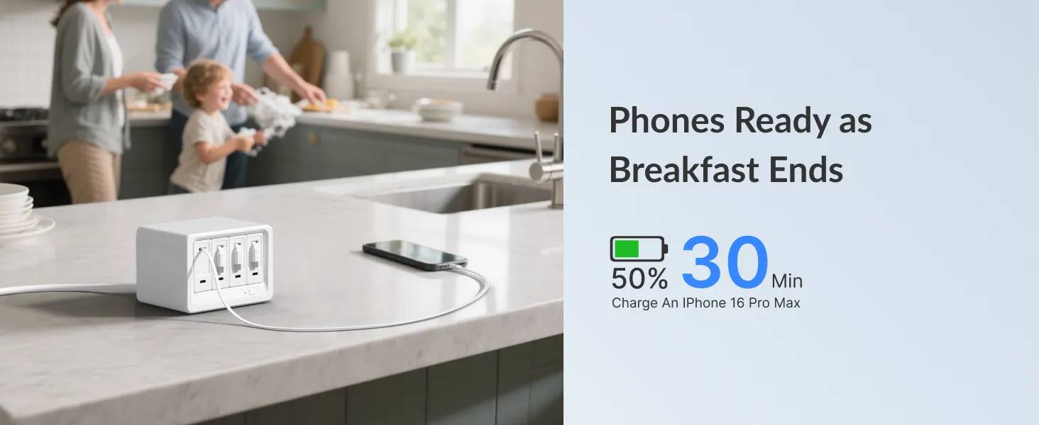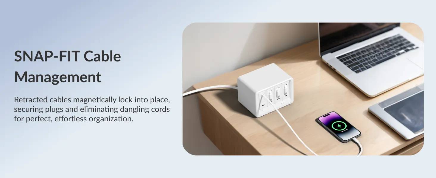 Compact Design, Seamless Use: The ultra-compact design saves 50% desk space compared to traditional setups, ideal for crowded desks, home offices, or travel. Enjoy a simplified charging experience without the hassle of constantly plugging and unplugging devices. Bonus: The 45° angled plug effortlessly fits behind furniture or tight wall sockets.