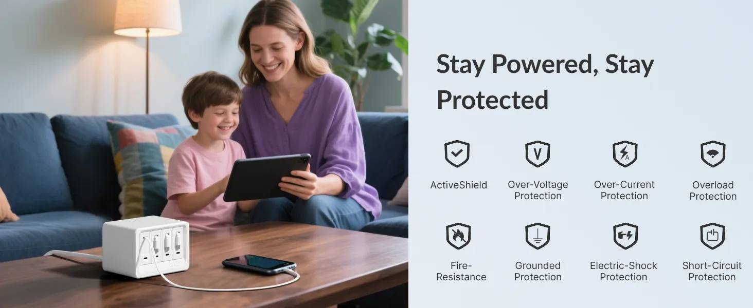 Power All Your Devices Safely: ETL-certified with industrial-grade 1020J surge protection, this charging station shields against voltage spikes, overheating, and short circuits. The fire-resistant casing and automatic shutoff ensure safety during storms or power surges. Ideal for high-end electronics like gaming PCs or 4K TVs—charge worry-free, 24/7.