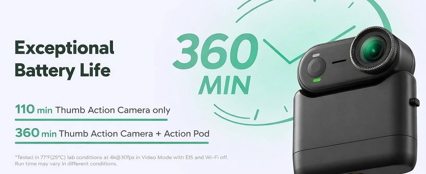 All-Day Power with the Action Pod - Never miss a moment with a massive 360 minutes of total recording time. The included Action Pod keeps you charged on the go, and since it supports charging while shooting, making it the ultimate companion for all-day events and long road trips.