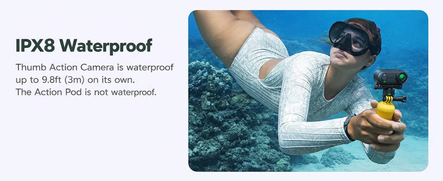 IPX8 Waterproof Body - Dive into the action without a bulky case. The camera body is waterproof up to 3 meters (10ft) right out of the box—perfect for surfing, snorkeling, or rainy-day vlogs. (Note: The Action Pod is not waterproof.)