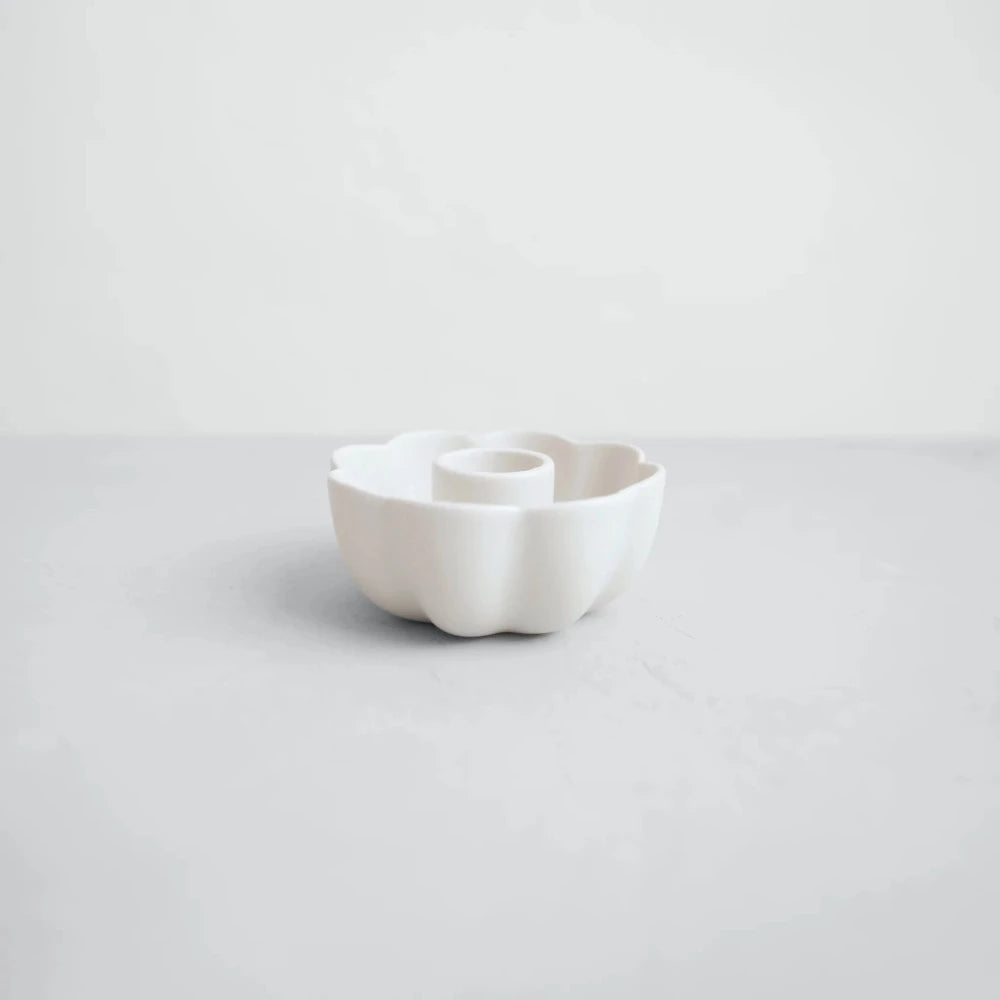 Our Ceramic Fleur Taper Holder from The Floral Society features a scalloped edge that adds softness and modernity. The Fleur Taper Holder is as beautiful as it is functional, with its blossoming petal shape, raised rim and natural, matte-white finish. The holder is sized to fit a standard taper candle. Great for gifting!