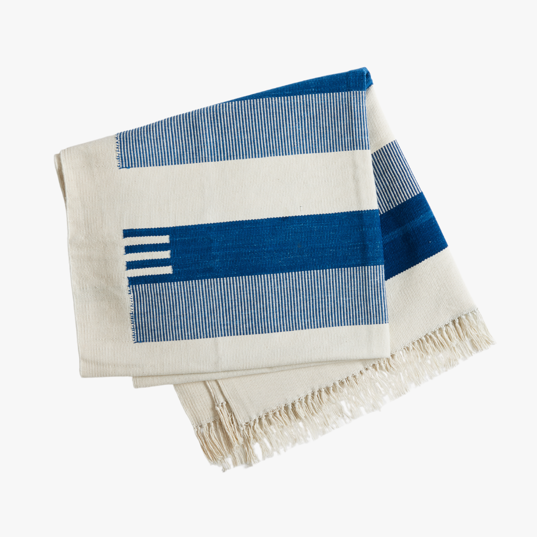 Inspired by the patterns and motifs Rajasthan and Gujarat regions, our Kangra Flatweave Rug is a modern take on traditional textile art. This hand loomed vegetable dyed flat weave rug features stripes in shades of indigo and ivory threads. Each end is accented with fringe detailing. Rug pad is recommended.